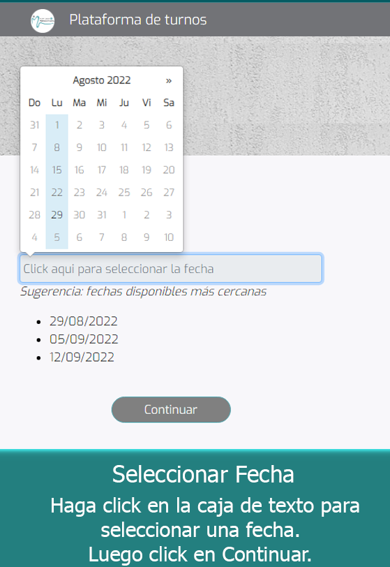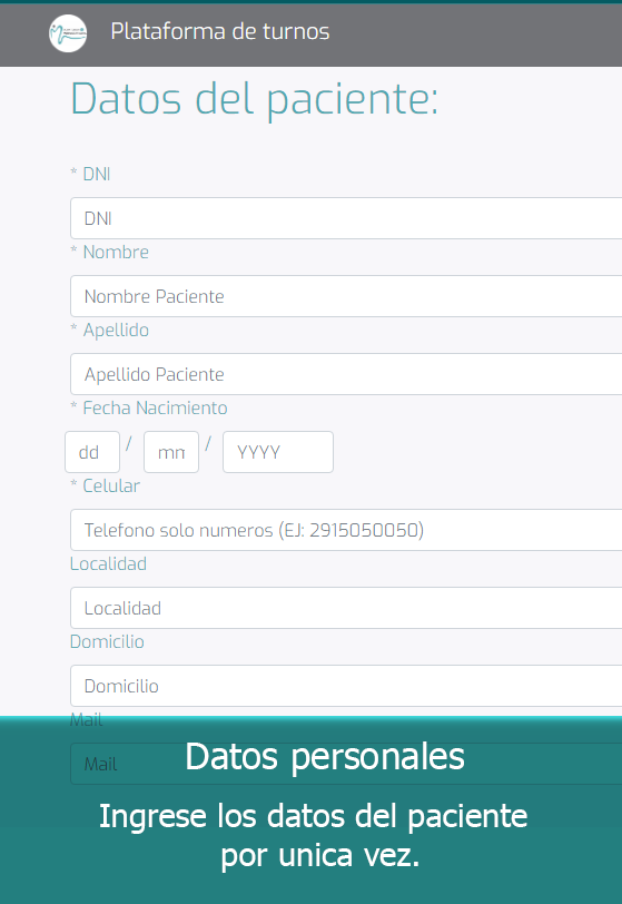 Los datos ingresados son para el uso privado del centro médico y tienen por única finalidad la individualización del paciente para la asignación (reserva/reprogramación/cancelación) de turnos médicos y contacto.